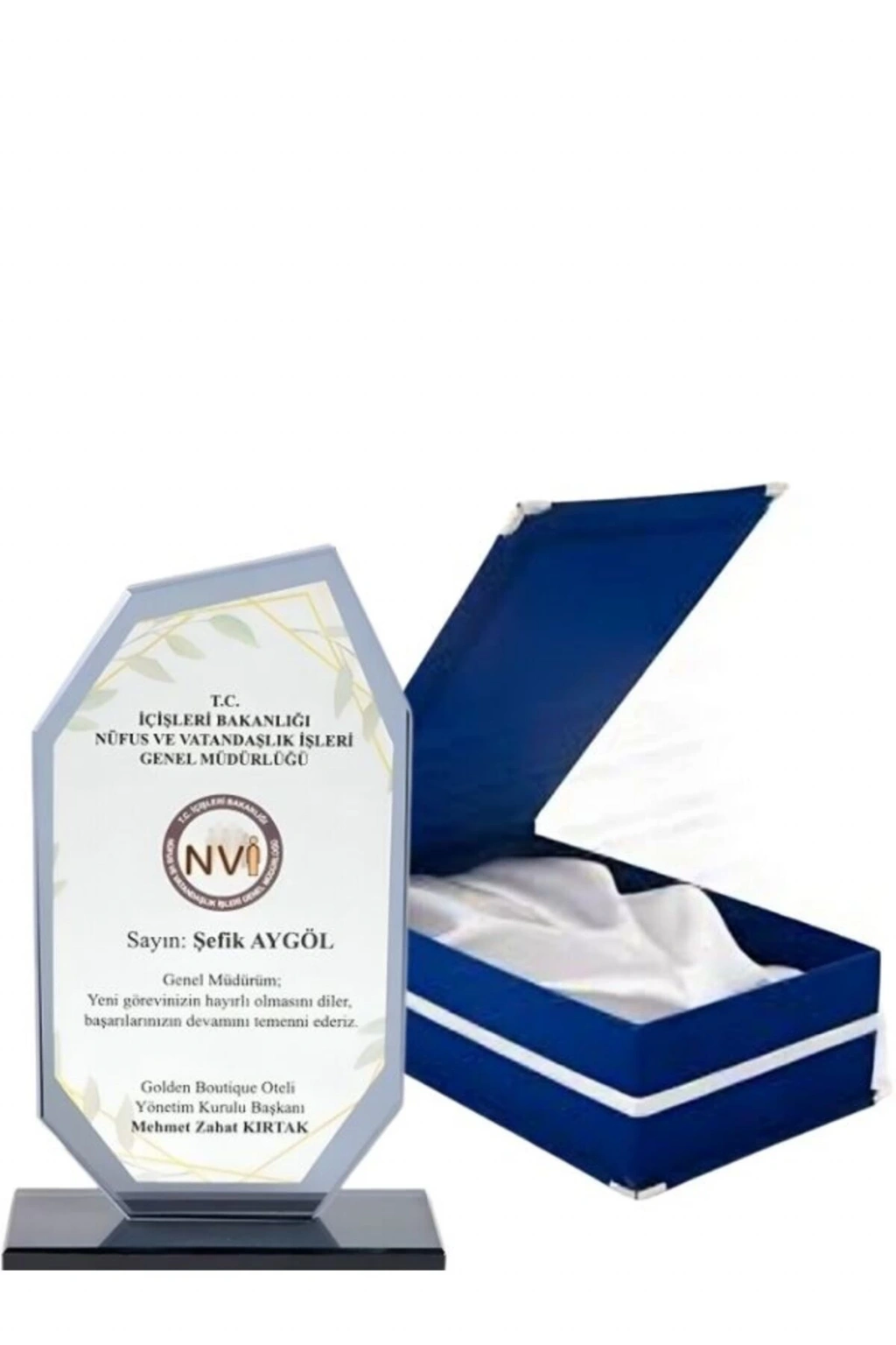 - Zarif tasarımıyla dikkat çeken kadife kutusu, plaketi şık bir şekilde sergilemenizi sağlar.; - Lüks cam malzemesiyle üretilmiş olan bu plaket, dayanıklılığı ve estetik görünümü ile öne çıkar.; - Lacivert renk seçeneğiyle modern ve sofistike bir dokunuş sunar; her türlü etkinlikte zarafetinizi yansıtır.; - Şeffaf cam yüzeyi sayesinde mesajınızı net ve okunaklı bir şekilde ifade ederken, kristal detaylarıyla göz alıcı bir parlaklık kazandırır.