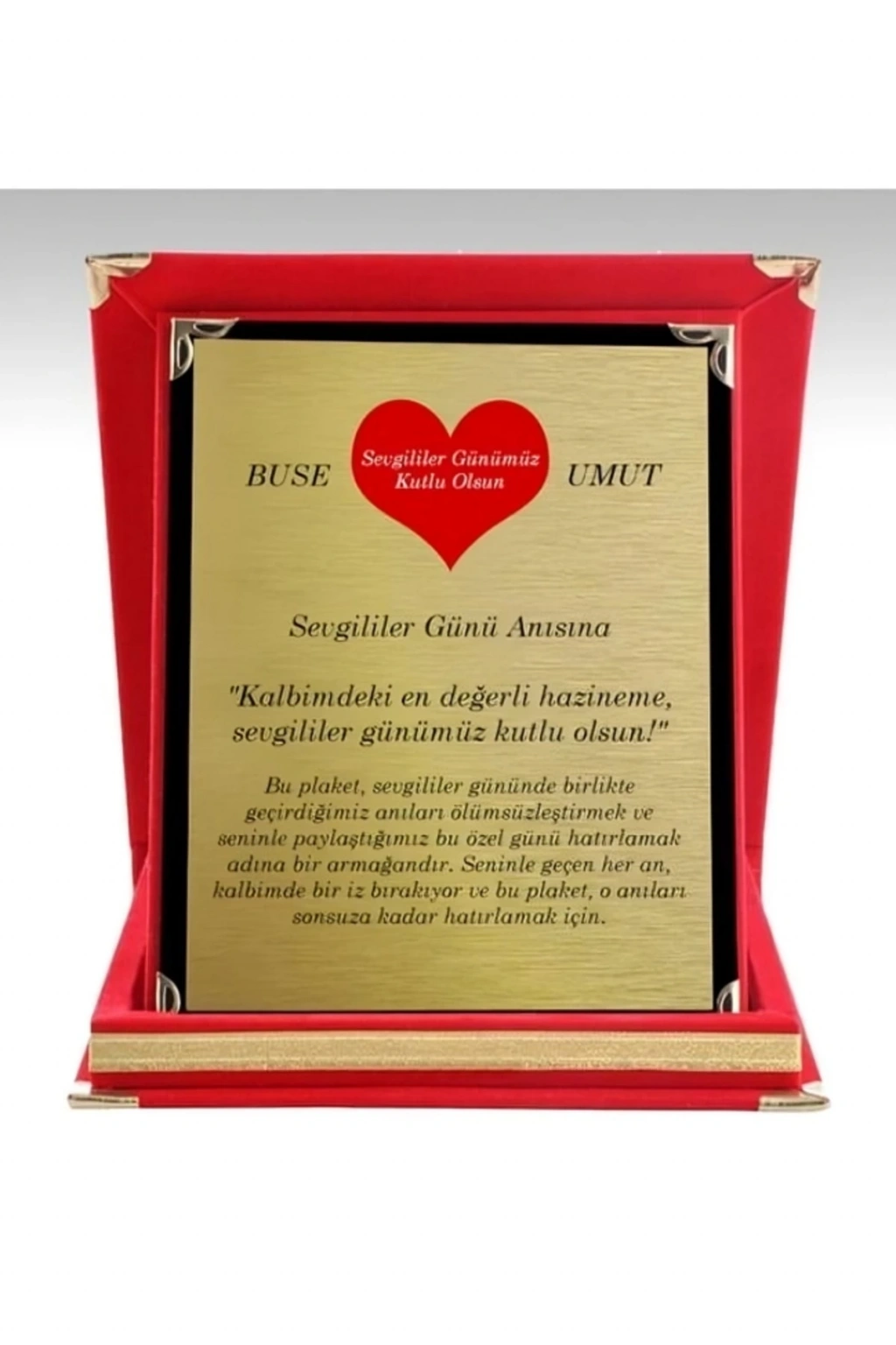 - Sevgilinize özel günlerde anlamlı bir hediye arayışınızda, Kişiye Özel Sevgililer Günü Plaketi ile sevginizin derinliğini ifade edebilirsiniz.; - Büyük boy tasarımıyla dikkat çeken bu plaket, sevgilinizin dekorasyonuna şık bir dokunuş katacaktır.; - Kişiselleştirilebilir mesaj seçenekleriyle, sevgiliniz için en anlamlı sözleri seçebilir ve bu plaketi onların kalbine taşırabilirsiniz.; - Özel gün kutlamalarınızda veya günlük yaşamınızda kullanabileceğiniz bu plaket, sevgilinizin favori dekorasyon parçası haline gelebilir.